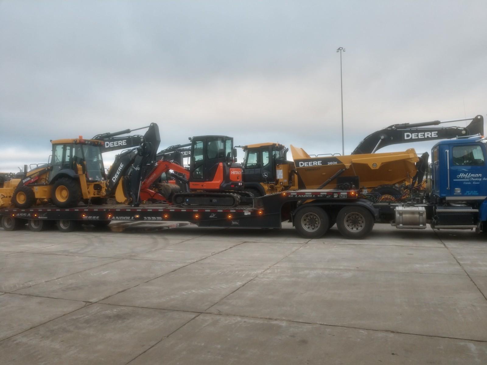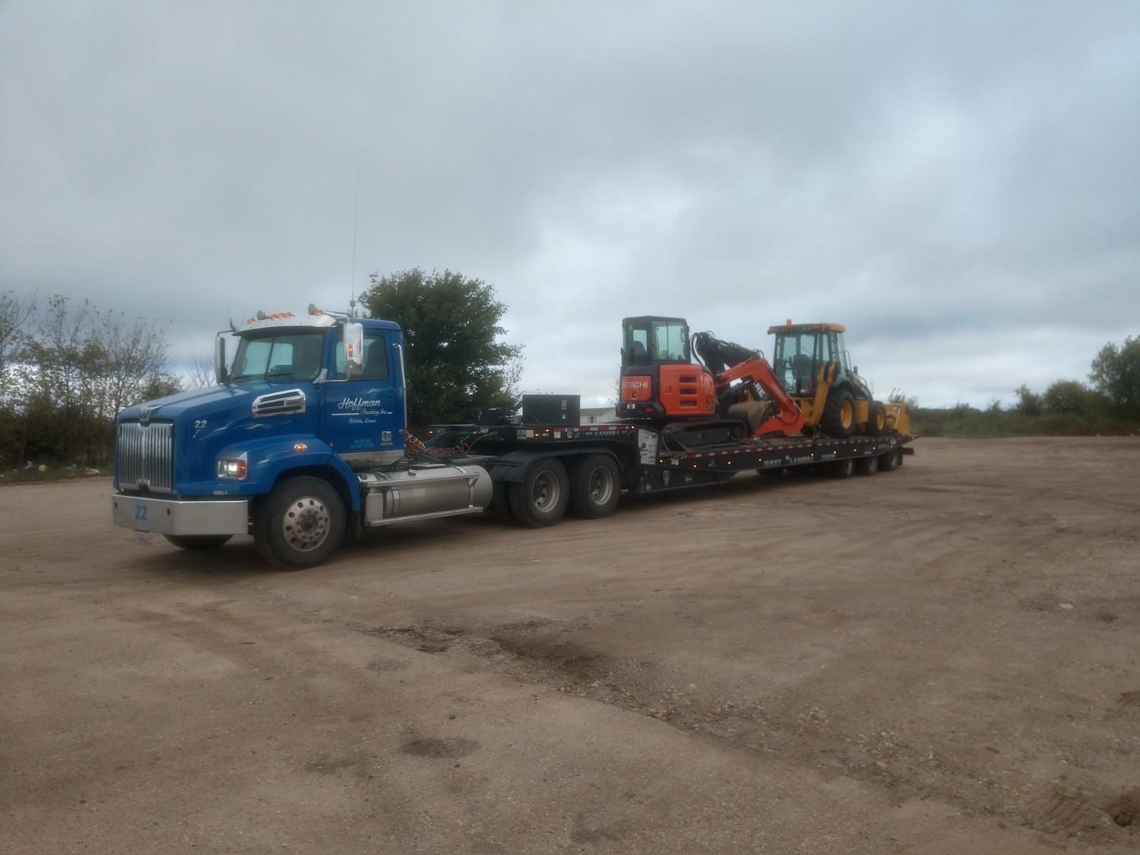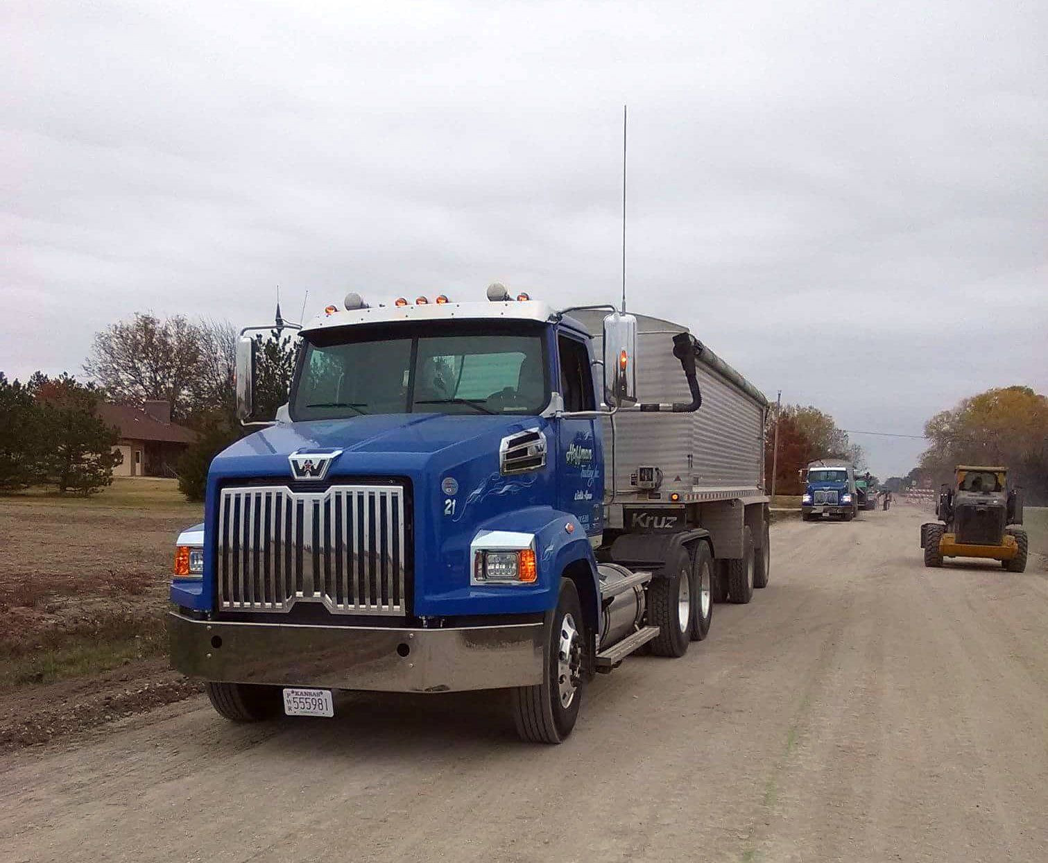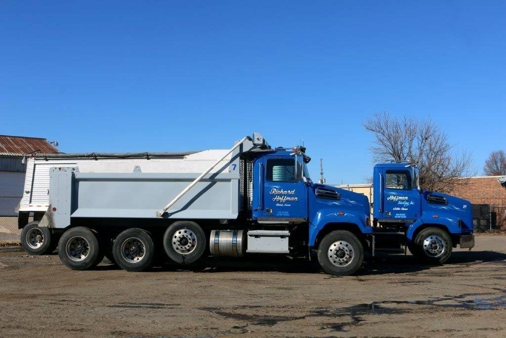 Our equipment includes 4 tractor trailers, with 4 aluminum end dumps and 1 steel barrel end dump for construction and bulk materials, 5 tandem steel bed dump trucks and 6 rough haul tandem bed trucks. We also can move your heavy equipment needs with our 53-Foot Lowboy Trailer or our 53-Foot RGN Trailer with a 24 1/2 foot well, in the state of Kansas.